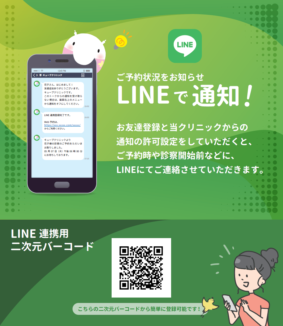 ご予約時や診察開始前などに、LINEにてご連絡させていただきます。